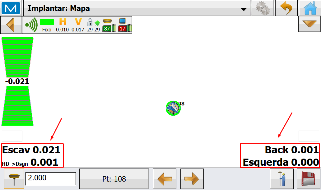 Para realizar a locação topográfica é necessário posicionar o receptor até que os valores estejam zerados ou os mais próximos do zero possível.