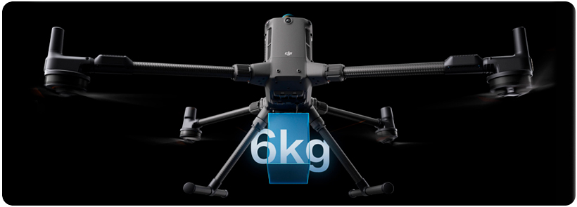 A forte capacidade de carga do Matrice 400 permite que ele atenda facilmente às demandas de uma ampla gama de aplicações. Com capacidade máxima de carga de 6 kg, o Matrice 400 suporta a troca perfeita entre um único estabilizador inferior e estabilizadores inferiores duplos. Ele também possui um terceiro conector do estabilizador na parte inferior para maior flexibilidade. A aeronave está equipada com 4 portas E-Port V2 externas, permitindo a montagem simultânea de até 7 cargas.